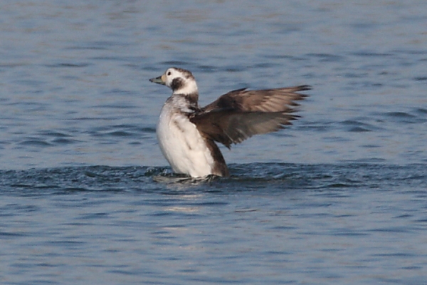 The 4 adult Bewick’s Swans Cygnus columbianus bewickii were at Rugmoor again, the 1st-winter female Long-tailed Duck Clangula hyemalis and the male Greater Scaup Aythya marila were both close in to the dam wall for a good part of the day, though the Scaup did venture back to the North Shore as well. During the afternoon I met Ian White who had seen the Common Sandpiper Actitis hypoleucos on the dam earlier in the day.  There were lots of large gulls sitting around on the flat water and there were quite a few small black midges in the air over the dam where I spent a while with the camera mid-afternoon. I was hoping to get some decent pictures of the Long-tailed Duck this afternoon in order to compare the plumage it arrived in with today, but it remained frustratingly just out of range of my telephoto lens. While I was watching it, I saw it preen, wash and then, rather amazingly, it dived and came up porpoising. It exploded clear of the water into another dive and repeated this several times in succession. I’ve never seen a duck do this before. Here’s a picture showing the dark wings and curious yellow staining around the base of the bill.