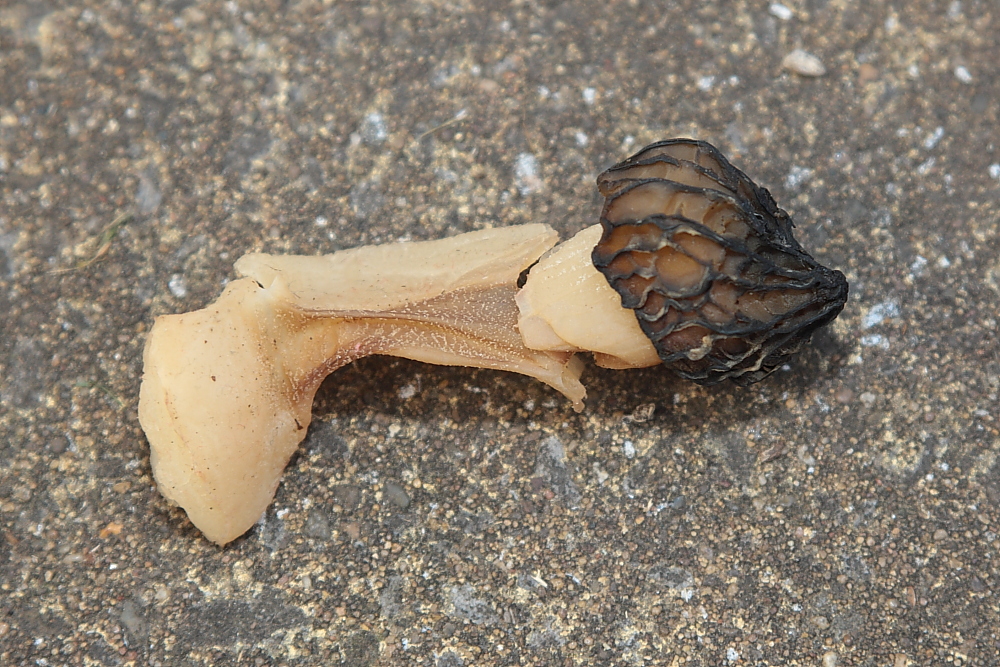 I was up early for another walk during which I counted 28 Winter Wrens Troglodytes troglodytes, 26 Blackcaps Sylvia atricapilla, 24 Chiffchaffs Phylloscopus collybita but only 2 Willow Warblers Phylloscopus trochilus. The main changes are yet another increase in Blackcaps but, as expected, most of the Willow Warblers have moved on. There were 3 Eurasian Reed Warblers Acrocephalus scirpaceus singing (2 in Pipe Bay reeds and another in Home Bay reeds). A pair of Eurasian Wigeon Anas penelope and 2 pairs of Gadwall Anas strepera (the males in heavy moult already) were at the dam end and a pair of Great Crested Grebes Podiceps cristatus were building a platform – if this is a nesting platform, it would be quite early at Blagdon Lake, where they tend to nest as late as July. My best find today, however, was a partly broken fungus at Top End that I popped into my pocket to bring home for identification. It showed a superficial resemblance to the Morels Esculenta spp. but after photographing the broken remains I sliced through the cap and proved it to be the Semifree Morel Mitrophora semilibera. The lower part of the cap was free of the stem as shown.