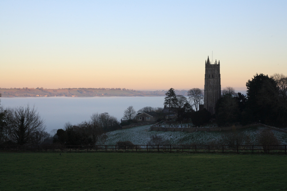 St. Andrew’s Blagdon at dusk, with fog in the Yeo Valley & sunshine on Nempnett Thrubwell © Nigel Milbourne 2016