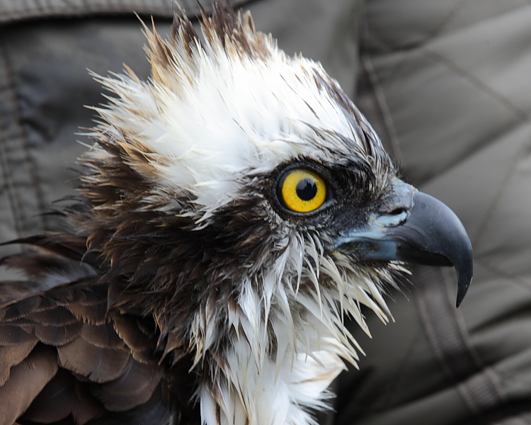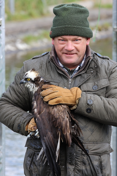 Dave Nevitt with male Osprey, White YA, Pumping Station © Nigel Milbourne 2013