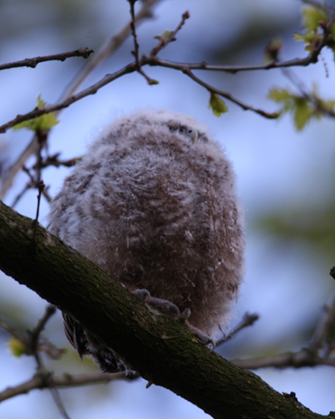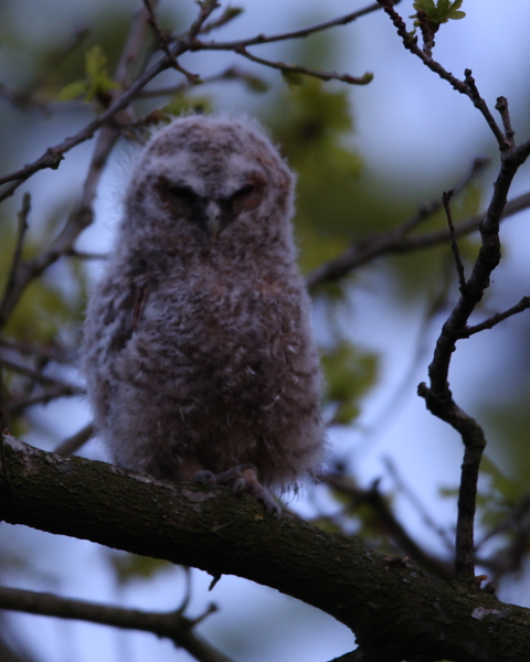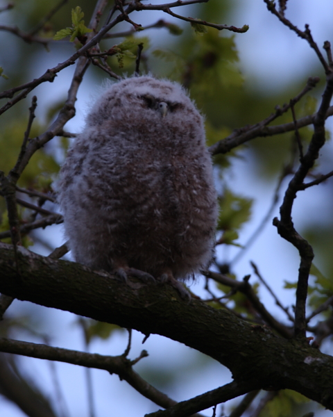I popped down to Blagdon this evening to try and get a shot of the 2 juvenile Tawny Owls Strix aluco that I’ve seen for the last few days hanging out of the nest box side-by-side. I set up in the gloom but there was no sign until one called right over my head! I spotted a ball of fluff which gradually turned into a little pot-bellied owl as I edged away to get some shots which don’t stand up to close scrutiny, but may make you smile. They’re known as ‘branchers’ at this stage.