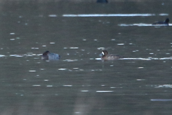 Mark Hynam and I walked the lakeside today from 0910hrs to 1430hrs trying to find Chiffchaffs, and more especially a Siberian Chiffchaff. We found two Chiffs, but neither called and we didn’t get prolonged views of either of them. We saw a Great White Egret Ardea alba at Indian Country, the pair of Egyptian Geese Alopochen aegyptiaca in Holt Bay, a female Blackcap Sylvia atricapilla in Lodge Copse, the Common Sandpiper Actitis hypoleucos on the dam, 34 Teal Anas crecca, just 2 Snipe Gallinago gallinago, 4 Shovelers, and heard 2 Water Rails Rallus aquaticus. However, at Top End I spotted a female Aythya with a huge well-defined white face blaze. We couldn’t do much with an identification through binoculars as it was on the far side of the lake. We decided to leave it and walk back to the cars at the Lodge. We drove back and I scoped it for ages, but it remained asleep! We each went our own way, but after some soup and a cuppa I went back with my camera. The bird had woken up by then, but I really couldn’t make a positive identification. It was the size of a Tufted Duck, but was essentially golden brown, especially the head (with paler ear covert patches), neck, mantle, and breast. The mantle was concolorous with the breast, but the flight feathers appeared darker. As noted earlier, there was a well-defined face blaze, a brownish eye, grey bill with a black nail, that may spread slightly and grey legs and toes with darker grey webs. The belly was whitish with a brown vent and speckled black undertail. The size suggested a possible Lesser Scaup, but the head shape was wrong, and there was no sign of any frosting in the flanks or mantle feathers. The head shape and extensive face blaze suggested Greater Scaup but the bird was surely too small. So, was it just a Tufted Duck? I suppose it could have been, but the head shape, bill pattern and extensive blaze was unlike any I’ve seen on a Tuftie. So, that leaves us with a probable hybrid, but what? I saw it wing flap a few times at dusk, but in truth it was too dark to decide if the colour of the panel in the primaries was grey or white. Perhaps I might get some pictures tomorrow, it might help – but it might not! Here’s the best I could do this evening; it will give you a sense of what we were looking at.