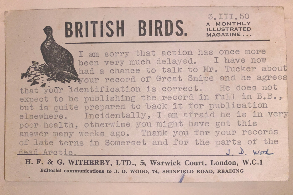 Then a few pages later, also bound into his copy of the report, is a card sent to Bernard and dated 3rd March 1950, that reads as follows: “I am sorry that action has once more been very much delayed. I have now had a chance to talk to Mr. Tucker about your record of Great Snipe and he agreees that your identification is correct. He does not expect to be publishing the record in full in B.B., but is quite prepared to back it for publication elsewhere. Incidentally, I am afraid he is in very poor health, otherwise you might have got this answer many weeks ago. Thank you for your records of late terns in Somerset and for the parts of the dead Arctic.” Signed by editorial assistant, J.D. Wood.